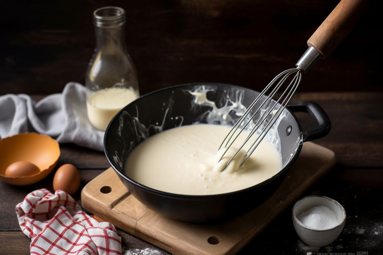 - Añade la leche caliente gradualmente, batiendo constantemente, para obtener una mezcla perfectamente homogénea.