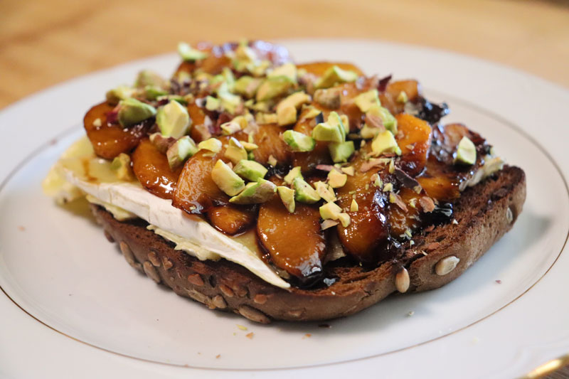 Toast de brie à la pêche au vin Pedro Ximénez et aux pistaches